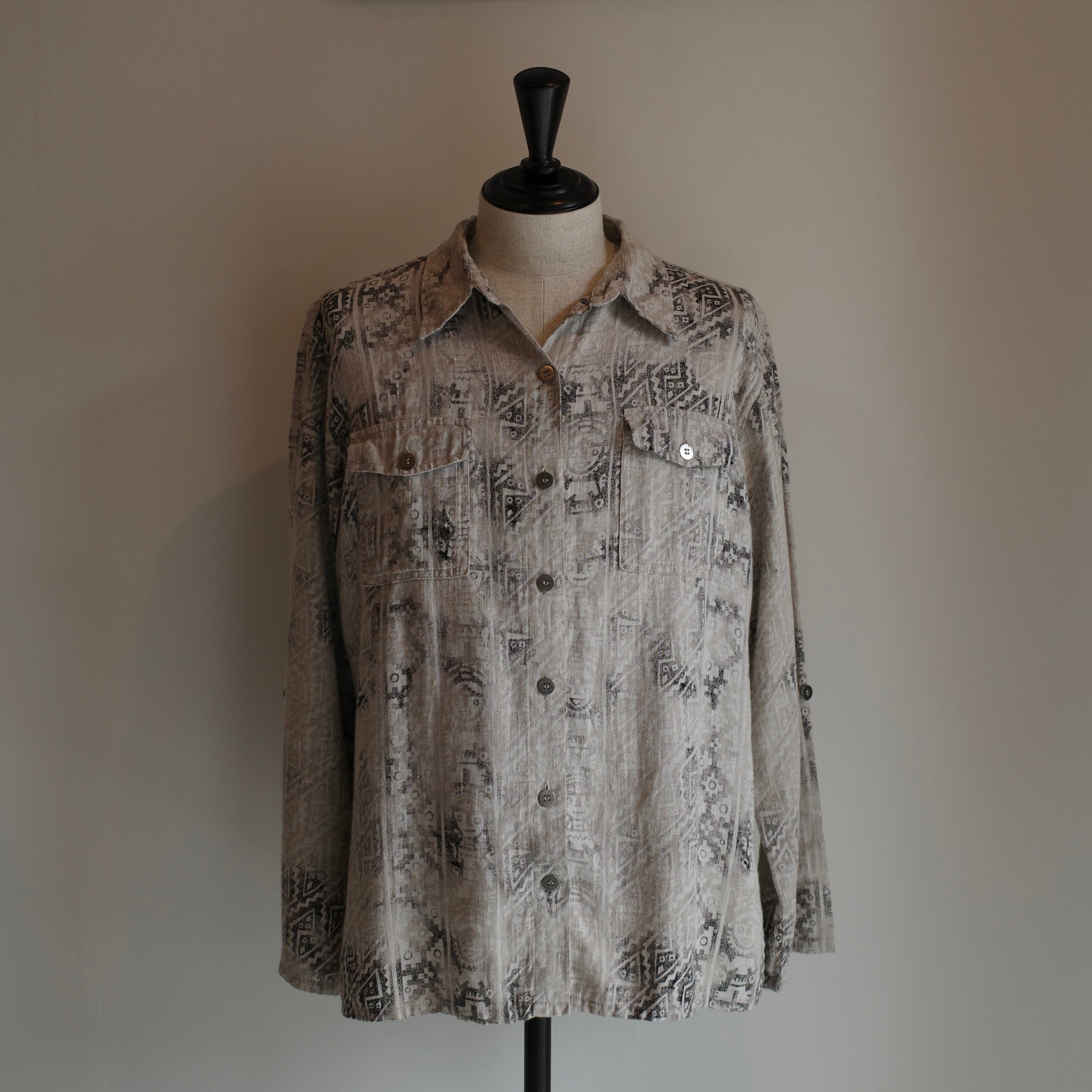100%リネン素材で仕立てられた、落ち着いたベージュトーンにエスニックパターンが映えるロングスリーブシャツ。