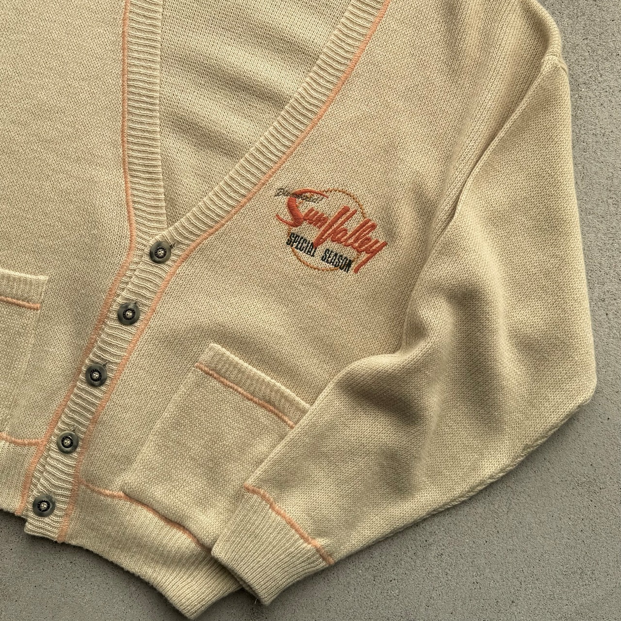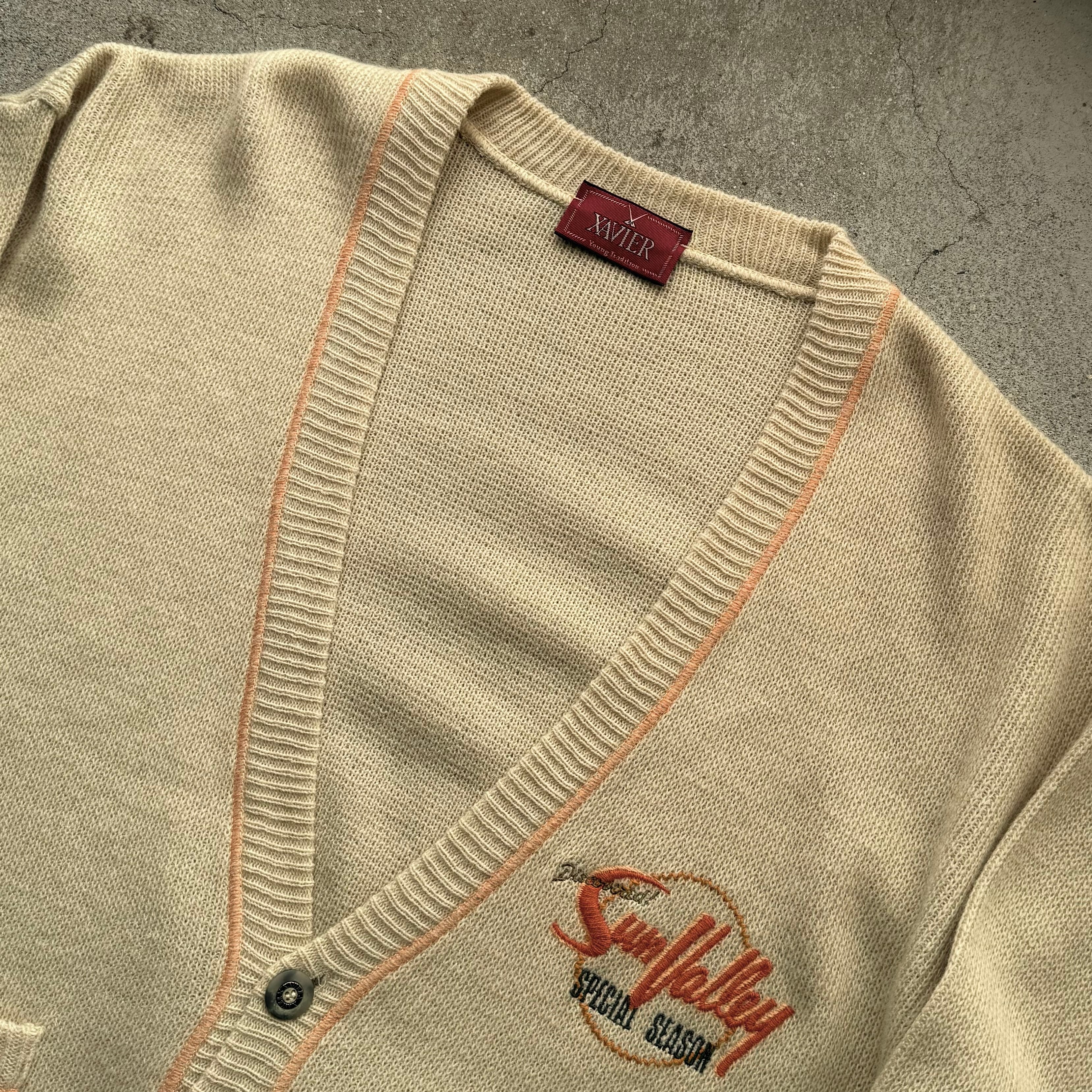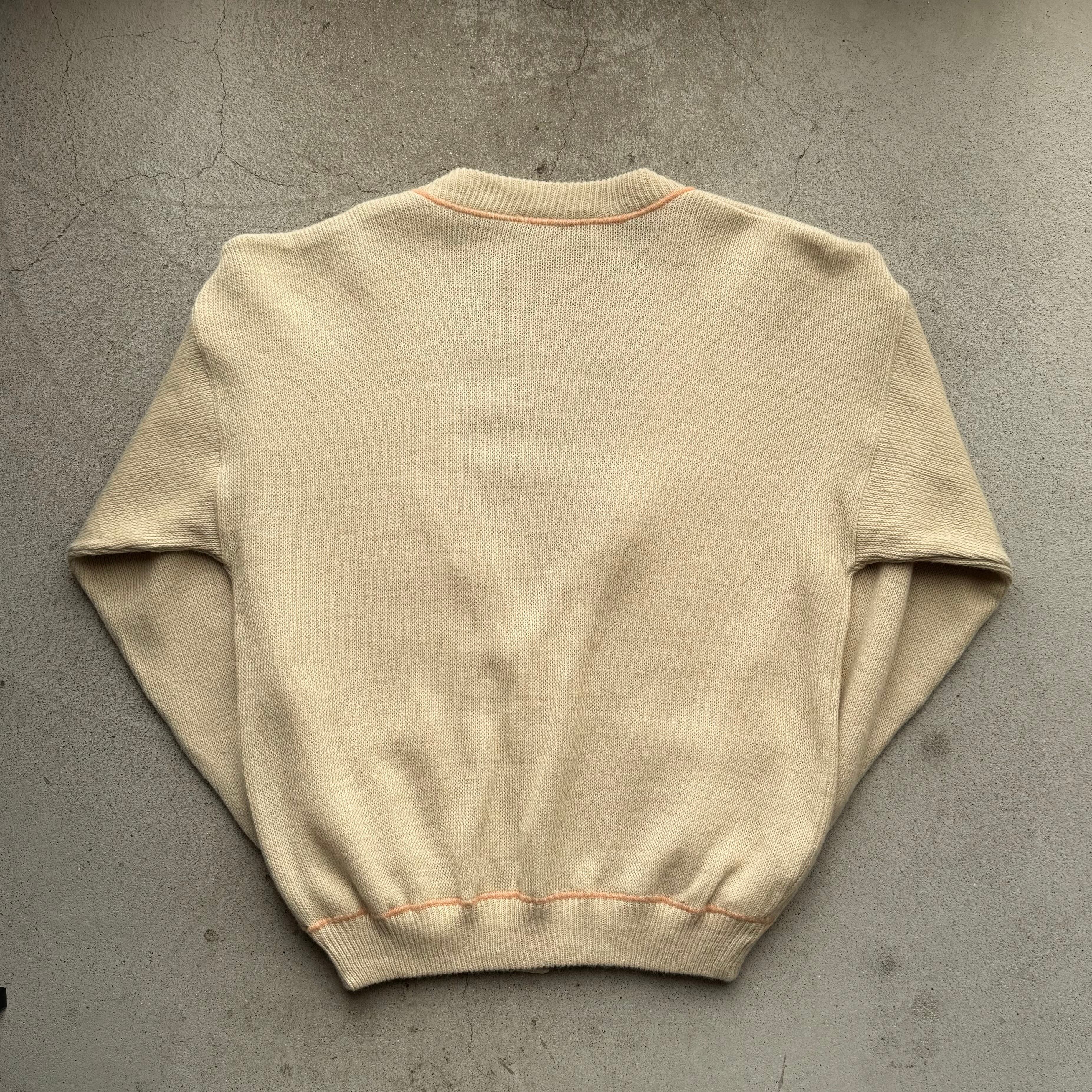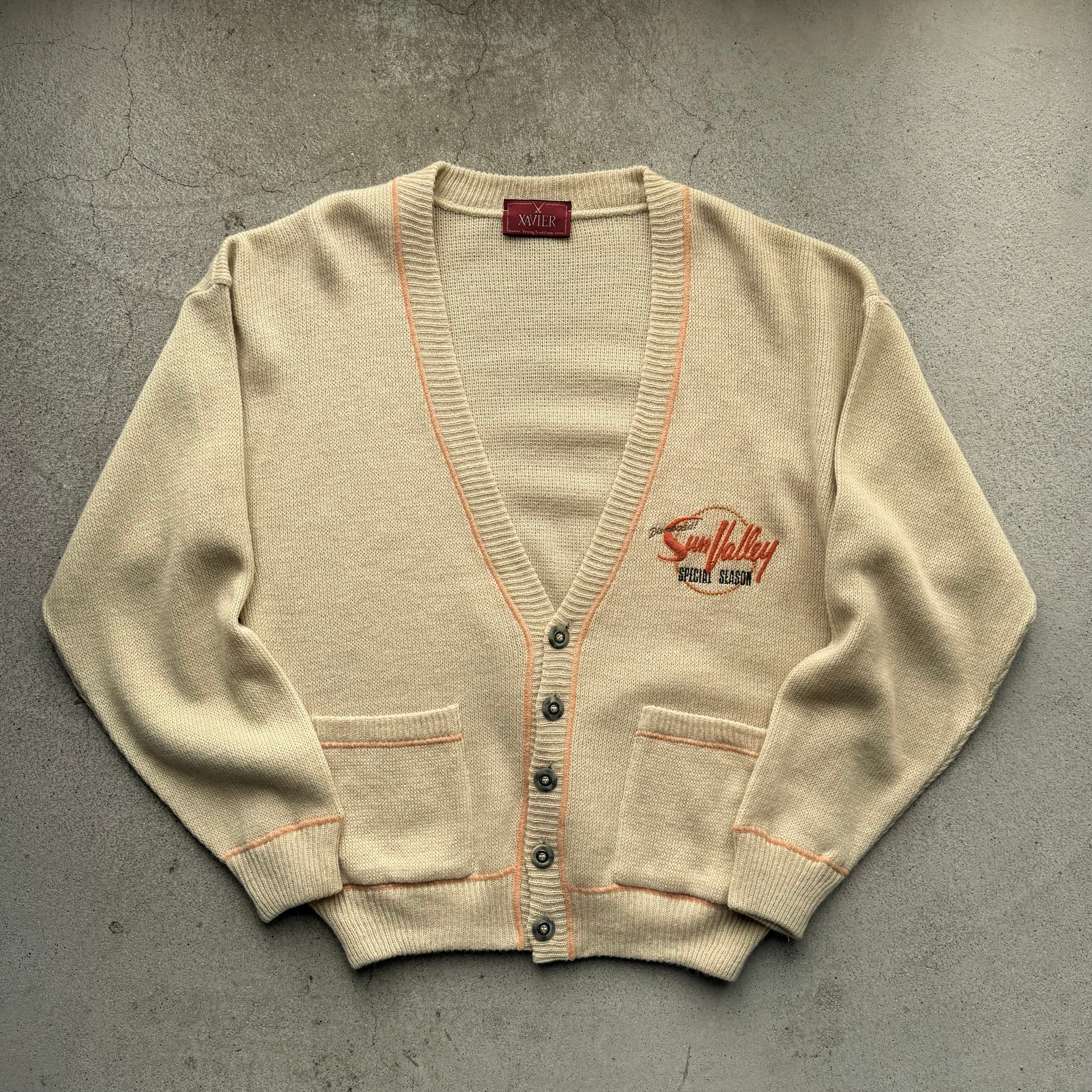 やわらかいベージュに配色ラインとロゴが映えるニットカーディガン。